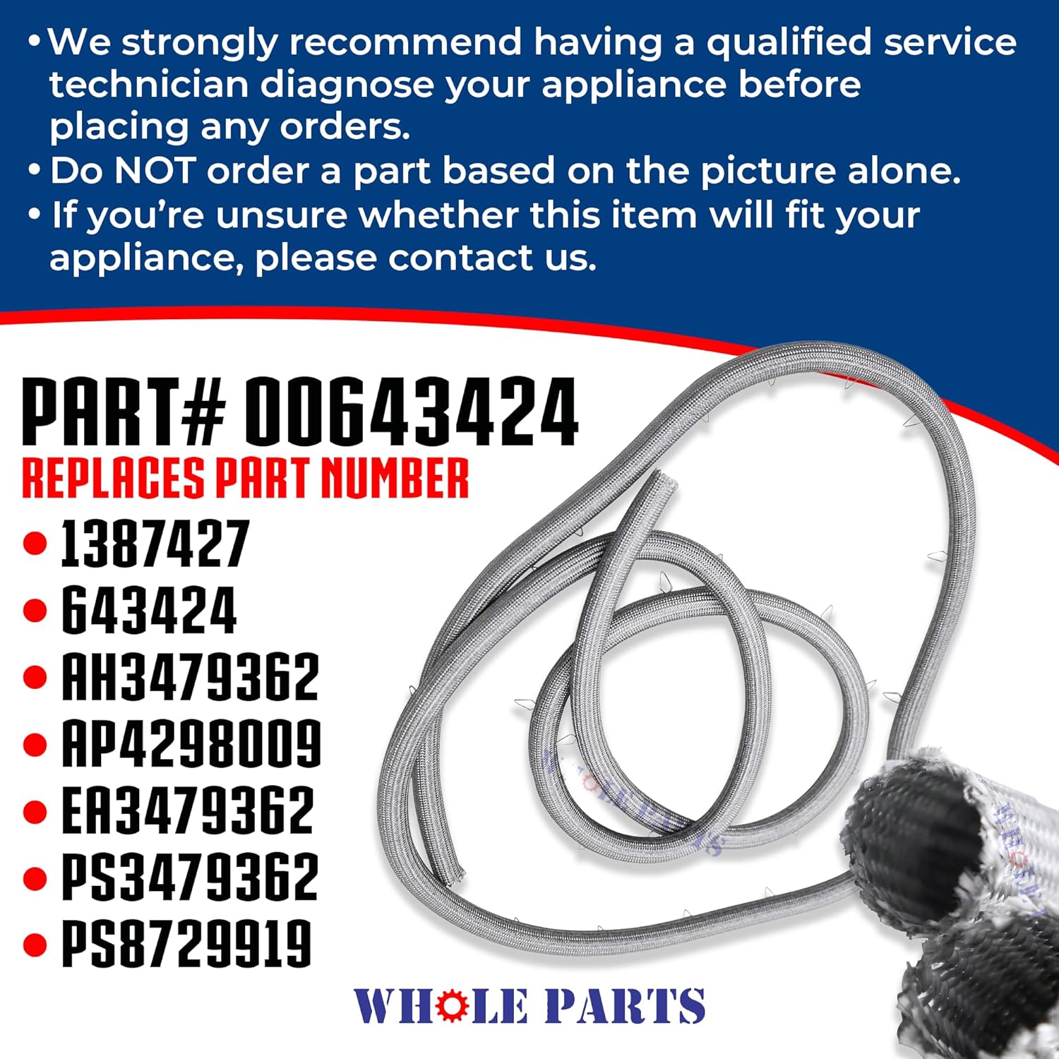 Whole Parts Range Oven Door Seal Gasket (Including 29 Mounting Clips) Part# 00643424. Approximate Length is 84.25 inches. This Part Replaces AP4298009, 1387427, 643424, AH3479362, EA3479362, PS3479362, PS8729919.