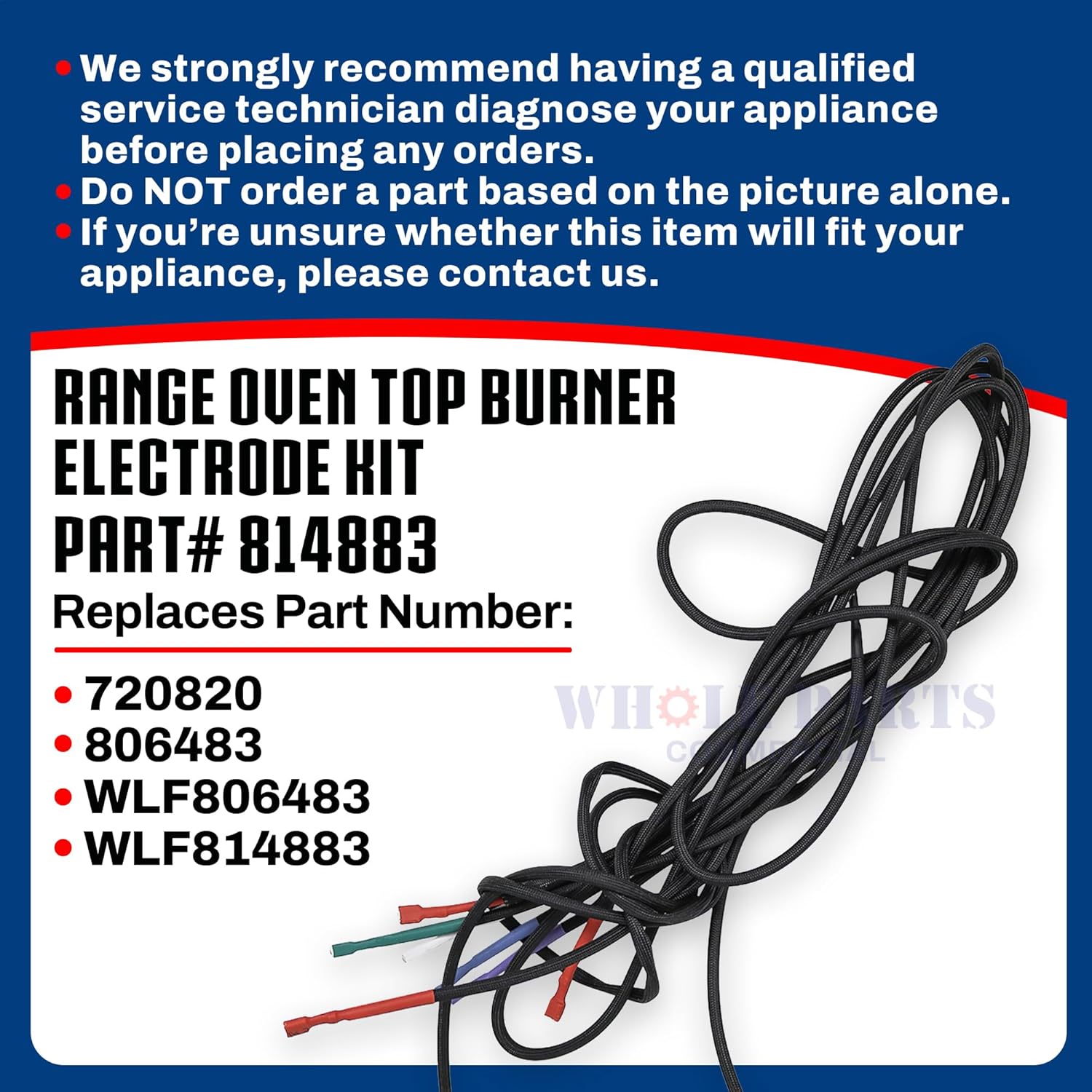 Whole Parts Range Oven Top Burner Electrode Kit (Including Electrode Ignitor and 5 Wires) Part# 814883. This Part Replaces 806483, 720820, WLF814883, WLF806483.