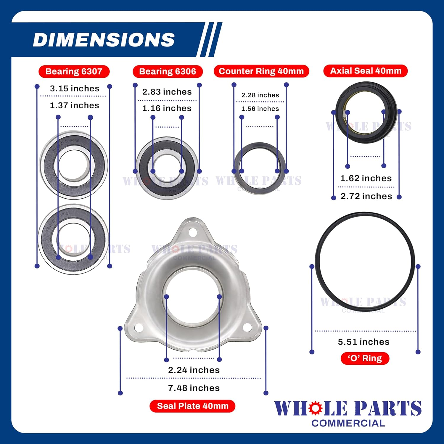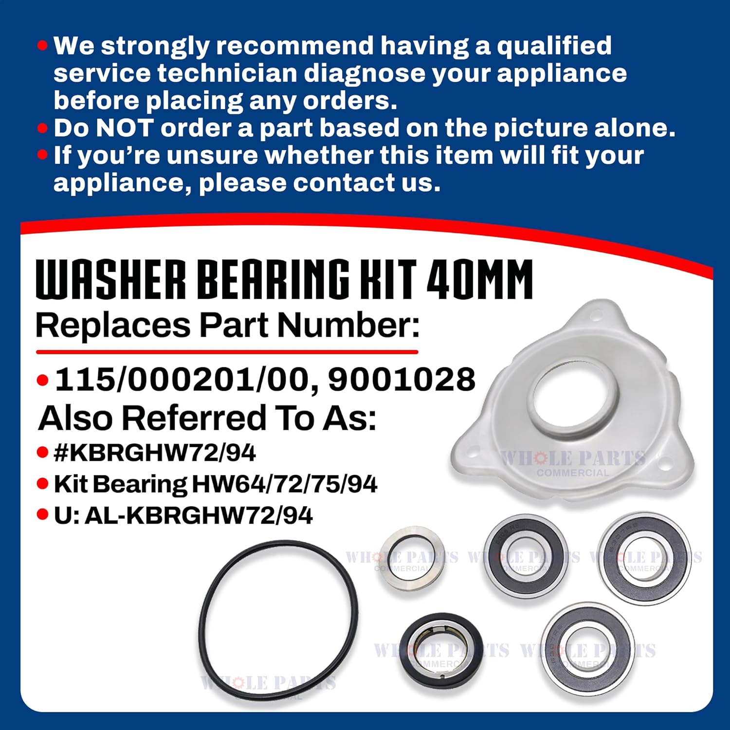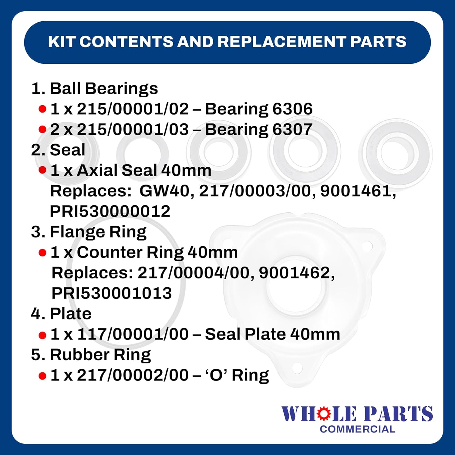 Washer Bearing Kit 40mm HW64 HW72 HW75 HW94 HF65 HF72 HF95. Replaces Part # 115/000201/00, 9001028. Also referred to as: – #KBRGHW72/94; – KIT BEARING HW64/72/75/94; – U: AL-KBRGHW72/94. Kit contents: 1 x 215/00001/02 – Bearing 6306; 2 x 215/00001/03 -Bearings 6307; 1 x Axial Seal 40mm, Replaces: GW40, 217/00003/00,9001461, PRI530000012; 1 x Counter Ring 40mm, Replaces: 217/00004/00,9001462, PRI530001013; 1 x 117/00001/00 – Seal Plate 40mm; 1 x 217/00002/00 – ‘O’ Ring.